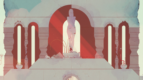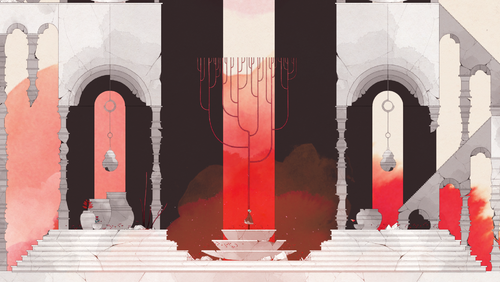 Gris的大场景画面可谓一绝,它及打破了单一视角/镜头沉闷,又很好的烘托了水彩所带来的神秘和大气。Gris频繁的拉伸镜头很好的缓解了解谜的沉闷,我觉得主创团队很有自知之明。在谜题简单的情况下通过视觉上的转变来调动大脑的运转从而让游戏本身显得不那么乏味。同时,当镜头渐渐拉远,荒凉的废墟全景若隐若现,不得不让人赞叹一句“一览众山小”。